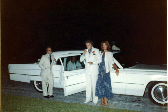 - ‘He’d show up in a limo…Andy Warhol came a couple of times’…The early Eighties: John, in white suit, with, left, ‘Nick-Knack’ Somerville; unidentified figure (inside limousine, on back seat); Marianne Hinton; unidentified figure (far side of limousine) [copyright: Private Collection]